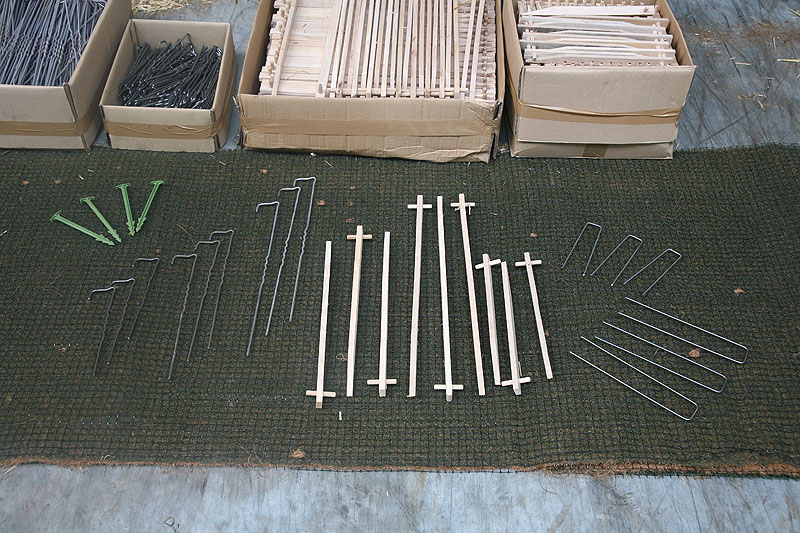Aby rohože Grünfix a další ochranné textilie odolaly větru, je nutné je kotvit do půdy pomocí upevňovacích hřebů. K dispozici jsou varianty ze oceli, dřeva nebo biologicky odbouratelných polymerů.